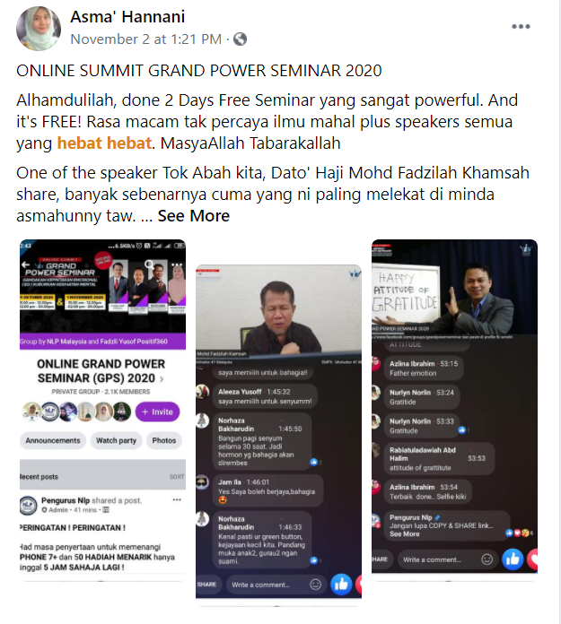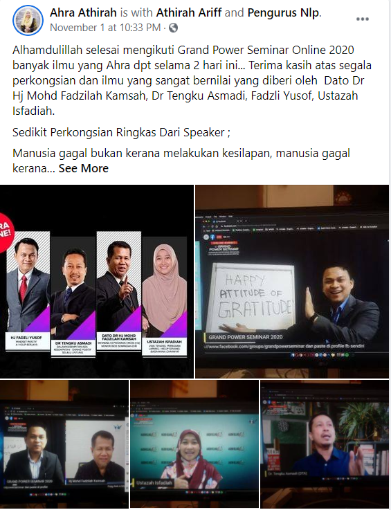 Bukan itu sahaja, anda juga akan bersama empat lagi sifu dan coach terbaik tanah air dalam bidang masing-masing. Seminar seperti ini lazimnya dikenakan yuran RM200–RM300 di luar sana, namun kami di NLP Malaysia sangat teruja untuk berkongsi manfaat ‘teknologi NLP’ yang telah membantu ramai individu menggandakan kejayaan hidup mereka.